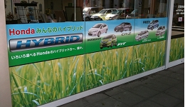 自動車販売店のショールームの店舗ガラス面を利用してインクジェット出力シート貼りの施工例です。