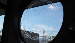 かっぱのイラストで有名な回転寿司店の入口横にあるガラス面にイラストを切り抜いたフォグラスシートを貼りました。ガラス面を遮る事なく店内も見えやすいようにフォグラスシートを使用してあります。