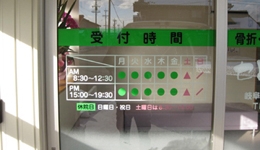 店舗入口扉のガラス面を利用して受付時間・営業日を表のようにして貼ってあります。