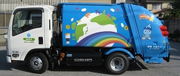 ゴミ回収用のパッカー車のボディ部分にインクジェット出力したステッカーを貼った自動車ラッピング施工例です。