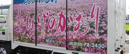 トラックの荷台部分はとてもシンプルですがそのスライドドアやボディを有効利用して運ぶ商品のPRをしています。かなりインパクトがあると思います。