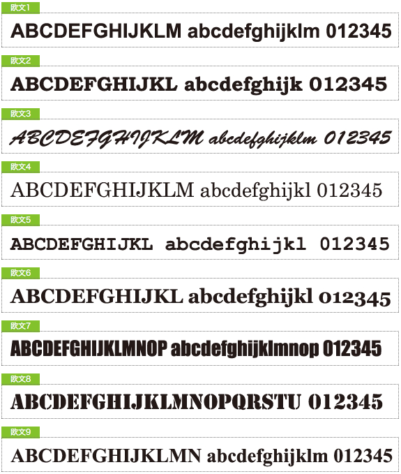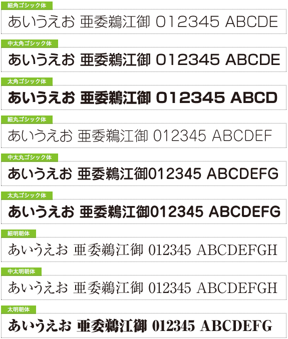 ※上記は一例です。上記以外にも多数の書体(フォント)を用意していますのでお気軽にお問合せください。