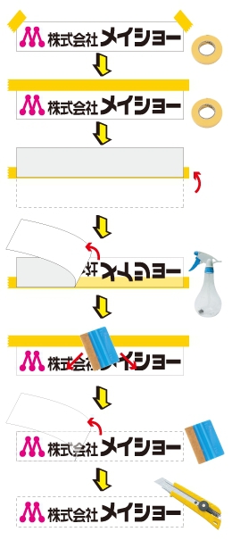 - 直貼り はカッティングシートを接着面に直接貼ります。水を使用できない場合はこちらになります。比較的短時間で作業が終わる事と比較的どんな条件でも貼る事ができます。しかし一度カッティングシートを貼ったら修正ができないため接着面などにゴミなどがあった場合は、気泡や粒として残ってしまいます。