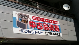 店舗の壁面を有効利用してアルミ複合板で製作した看板を直接取り付けました。屋外用両面テープとコーキングのみですがしっかりと固定されます。
