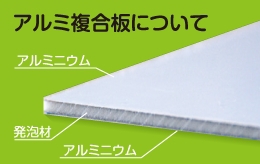 表面はアルミニウムですが内部は発泡材(プラスチック)のため、軽量で取り扱いが便利なため取付作業をする看板業者にもメリットのある材料です。